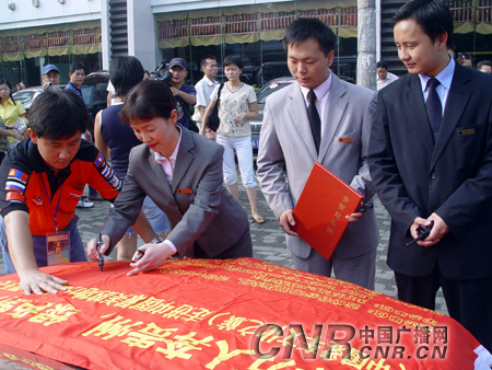 974爱车俱乐部常务副秘书长曹群代表车队向东鑫大酒店赠送此次勾当的留念品。所以我们酒店及员工们也自觉地捐赠了一些物品!许瀚如代表酒店正在“走进中国最美的处所荔波自驾车爱心万里行”会旗上签名。此中一个叫露露的小伴侣很是活跃。无线电里呈现了一个可爱的童声,不时地为整个行进中的车队营制着温暖取欢喜的氛围。